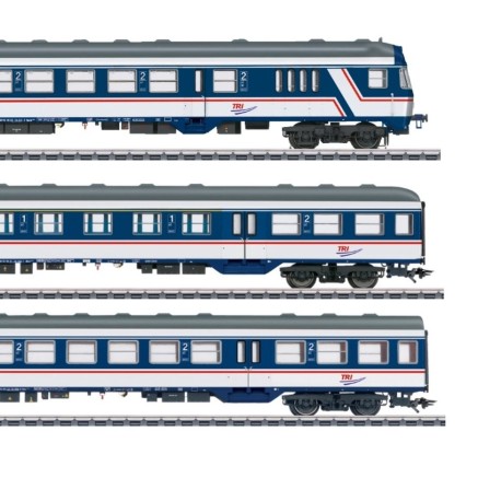 Passend zur "Elefanten-Lok" erscheint ein Wagenset aus drei Nahverkehrswagen der Typen Bnrdzf 463.0 (Steuerwagen), ABnrz 403.4 (Sitzwagen 1./2.Klasse) und Bnrz 450.3 Sitzwagen 2. Klasse)
